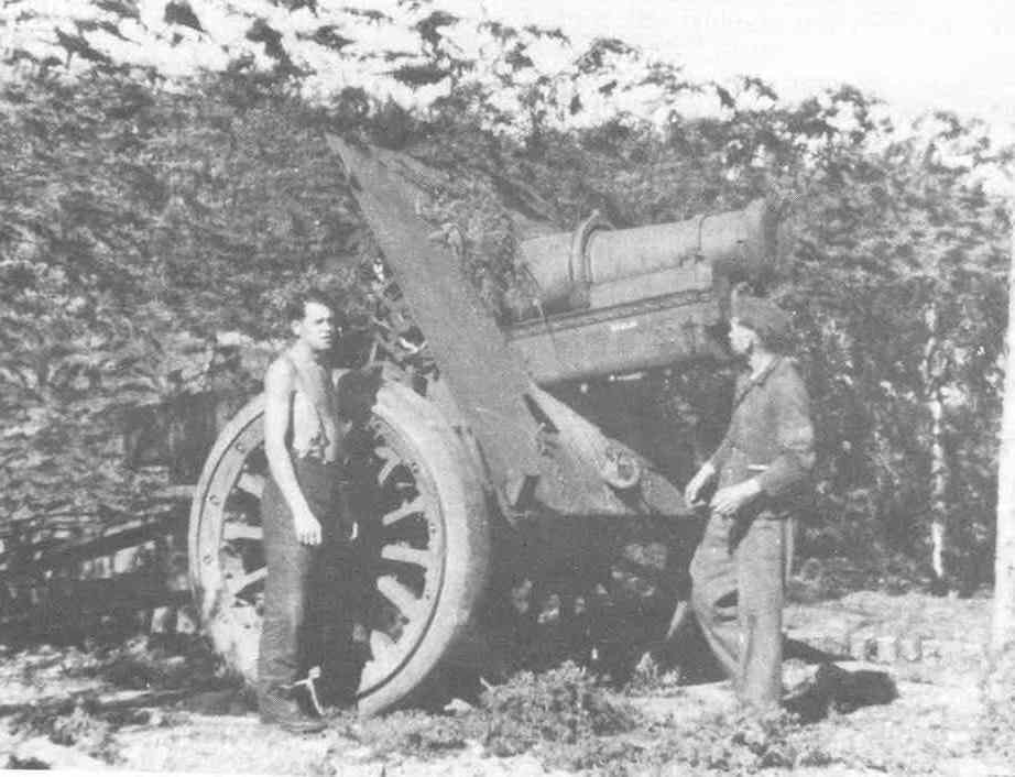 Ich kann aus den Aufzeichnungen nicht ersehen, an welchem Tag uns in die neue Feuerstellungen die neuen französischen Geschütze durch schwere Zugmaschinen einer fremden Einheit zugeführt worden sind. Sie trugen die Bezeichnung: 15,5 cm - s.F.H. 414 (f). Nach ihrer Bauart waren sie eigentlich nur für Pferdezug vorgesehen, keinesfalls jedoch für 12- bzw. 18-to Zugmaschinen, denn die Räder waren eisenbereift und hatten Holispeichen. Die Schußtafeln und die zugehörige Munition waren französisch beschriftet, in besonderen verzinkten Behältern für die Pulverbeutel, nach Ladungen beschriftet und mit mehrfachem Schraubverschluß. Die Zünder zu den 15,5 cm Granaten waren in Holzkisten gelagert und konnten als AZ oder als m.V. (mit Verzögerung, kurz und lang) gestellt werden. Sie waren auf die Granaten aufzuschrauben. Es war also gar nicht so einfach, Kanonieren, welche aus dem Einsatz mit IF.H. 16 bzw. 18 kamen, kurzfristig diese neue Handhabung bei Zubringen.