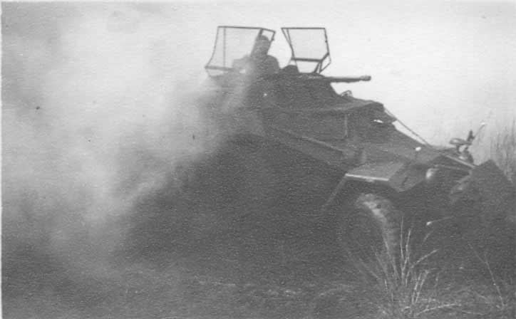| Soldaten der Abteilung vor einer Übung. | Ein Sd.Kfz. 222 bei einer Übung. Im Vordergrund eine Nebelkerze. |