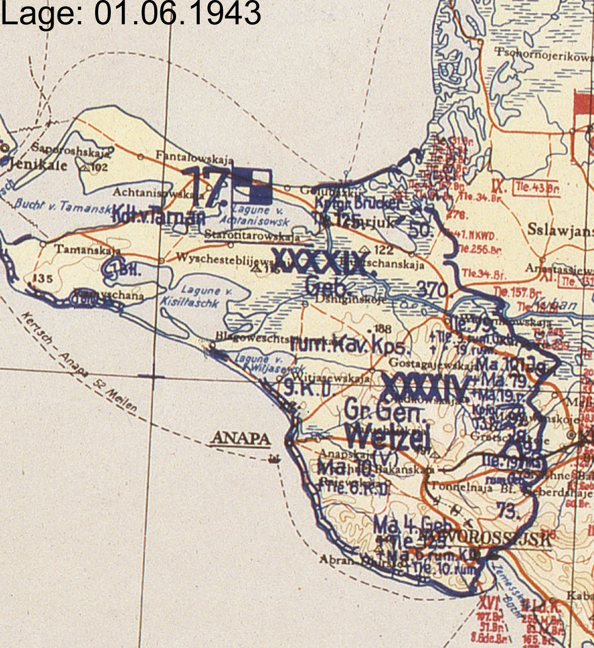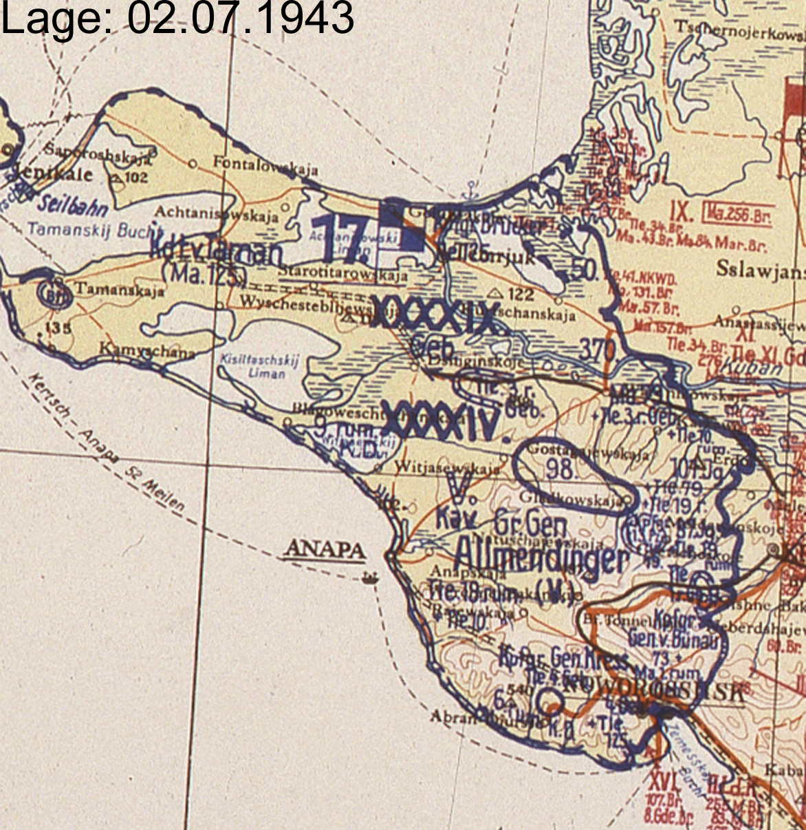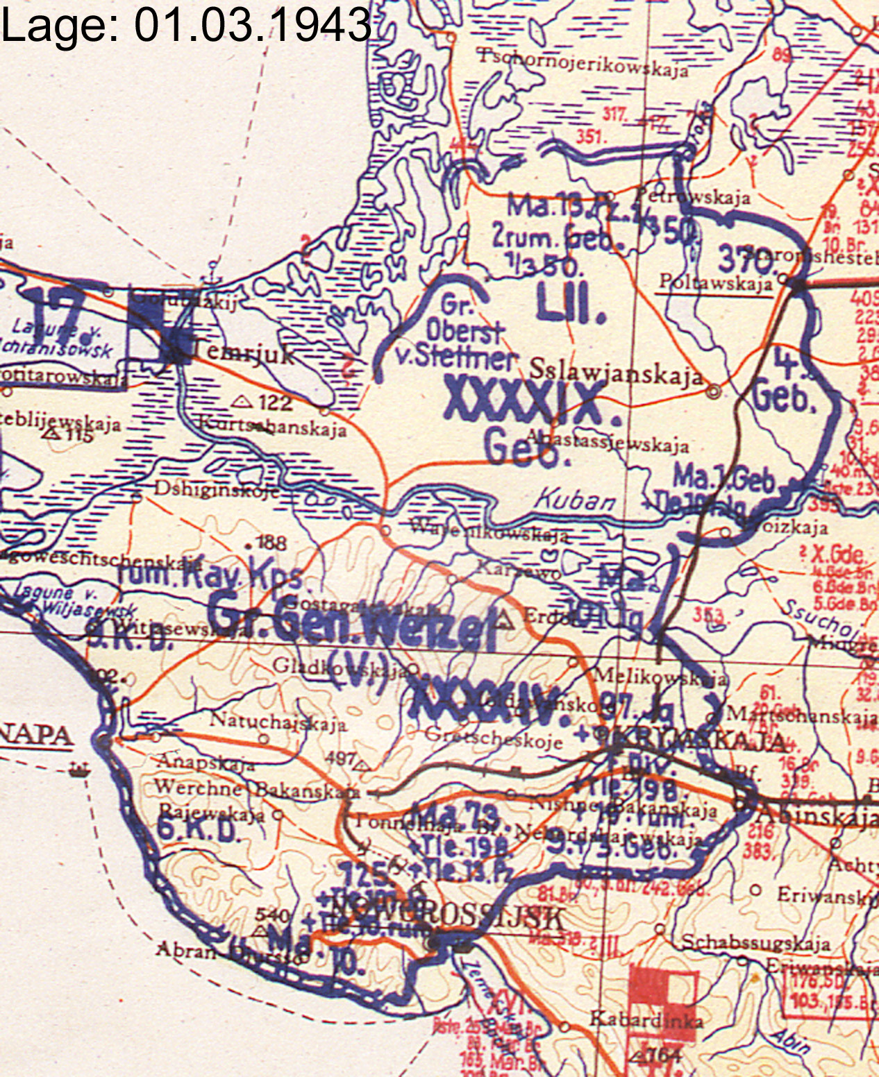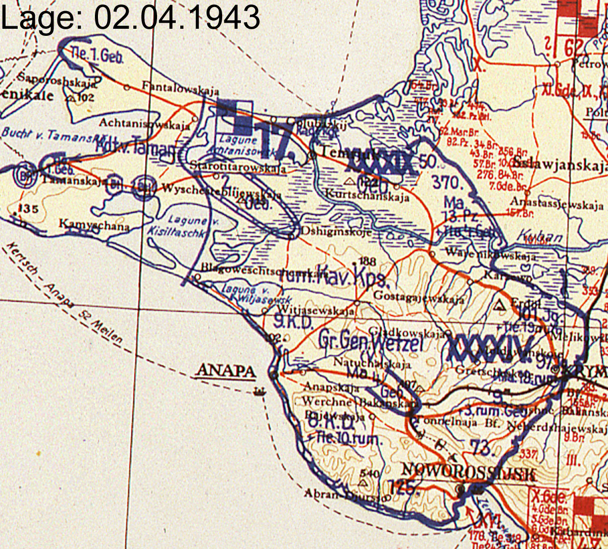 | 22. Februar | XXXXIV | 17. Armee | A | Kuban (Lagekarte) (Lagekarte) (Lagekarte) |