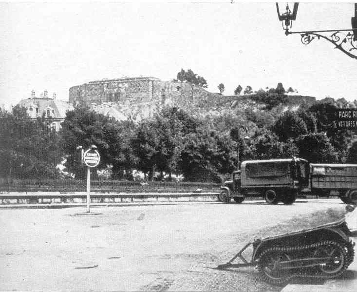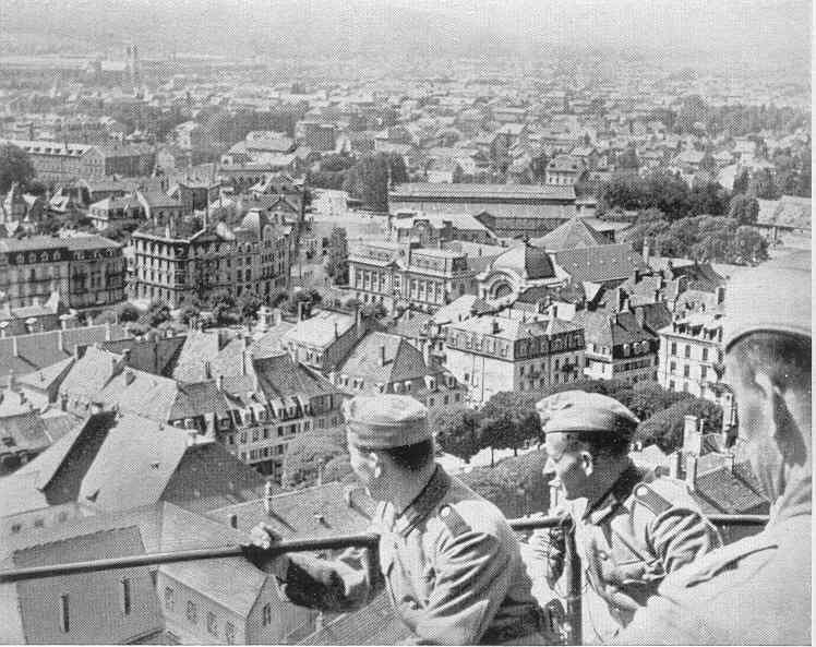 | Die Festung Belfort im Juni 1940. Im Vordergrund zurückgelassenes französische Kriegsgerät. | Deutsche Soldaten schauen auf Belfort. Juni 1940. |