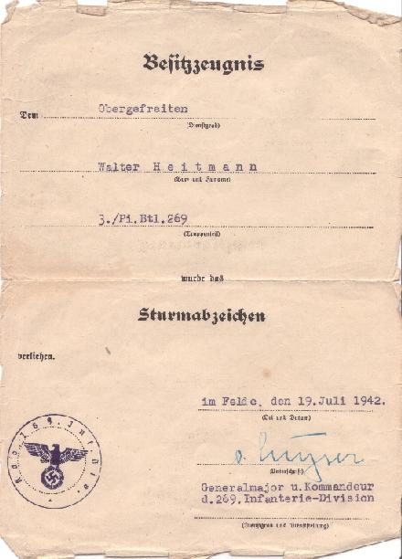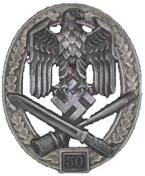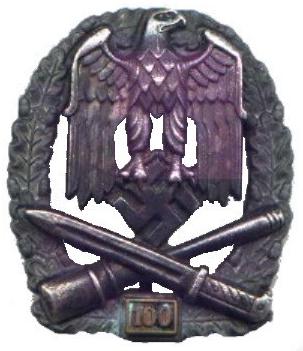 "Für Soldaten aller anderen Waffen, einschließlich der Sturmartillerie, die mit der Infanterie oder Panzern zusammen kämpfen, oder im eigenen Verband die Bedingungen des Infanterie-Sturmabzeichens erfüllen, wird ein besonderes Sturmabzeichen mit den Bestimmungen für das Infanterie-Sturmabzeichen mit Wirkung von 1. 6. 40 geschaffen."2 |