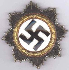 Zur Anerkennung vielfacher außergewöhnlicher Tapferkeits- oder Führungstaten hat der Führer und Oberste Befehlshaber der Wehrmacht den Kriegsorden des Deutschen Kreuzes gestiftet. Der Orden des Deutschen Kreuzes ist ein Wehrmachtsorden und wird für vielfache außerordentliche Verdienste in der militärischen Kriegsführung in Silber, für vielfach bewiesene außergewöhnliche Tapferkeit oder für vielfache hervorragende Verdienste in der Truppenführung in Gold verliehen. Der Orden besteht aus einem achtzackigen, dunkelgrauen, silbergeränderten Stern von 65 Millimetern Durchmesser, der in einem silbernen bzw. goldenen Loorbeerkranz auf mattsilbernem Feld ein schwarzes, silbergerändertes Hakenkreuz trägt. Der Loorbeerkranz zeigt unten die Jahreszahl 1941. Das Deutsche Kreuz wird ohne auf der rechten Seite getragen." |