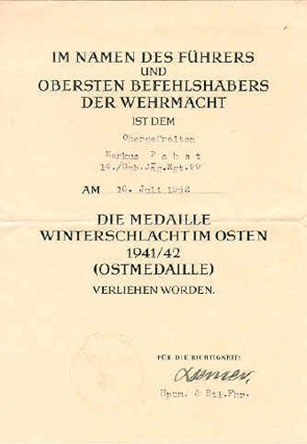 In Würdigung des heldenhaften Einsatzes gegen den bolschewistischen Feind während des Winters 1941/42 stifte ich die Medaille "Winterschlacht im Osten 1941/42" (Ostmedaille).