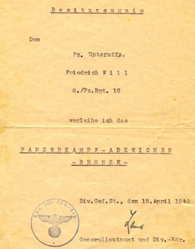 Das Panzerkampfwagenabzeichen in Bronze wurde "in Anerkennung der in vielen Sturmangriffen gezeigten Bewährung aller Teile des Heeres und als Ansporn vollsten Einsatz des einzelnen Mannes" vom Oberbefehlshaber des Heeres, Generaloberst Brauchitsch, für die Angehörigen der Schützenregimenter, der Kradschützenbataillone der Panzerdivisionen und der Panzerspäh-Einheiten gestiftet. Die Verleihungsbedingungen waren die selben wie beim Silbernen Panzerkampfwagenabzeichen. Am selben Tag wurde das »Panzerkampfwagenabzeichen« in »Panzer-Kampfabzeichen« umbenannt.3 |