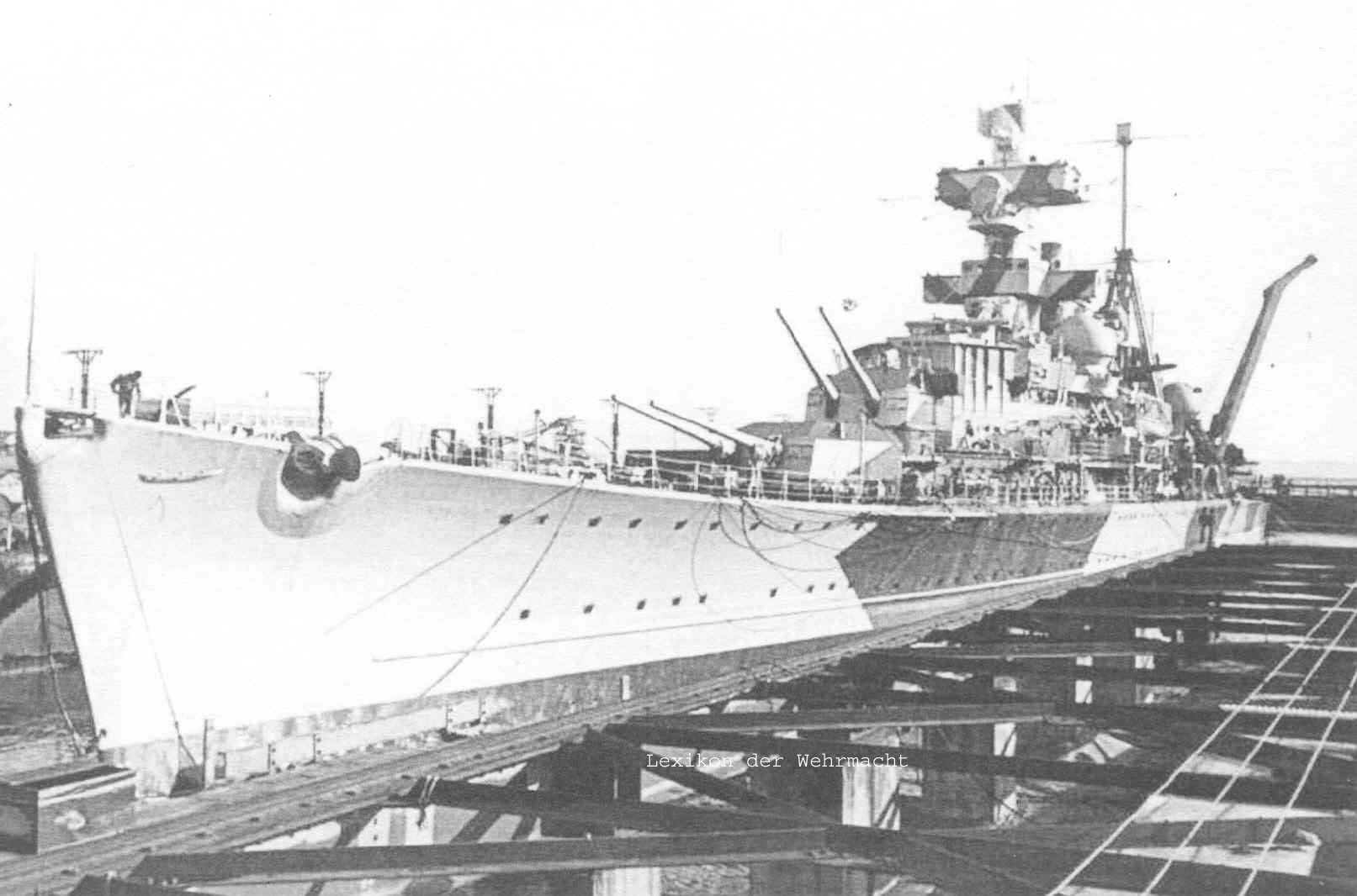 "Gneisenau" durch ein britisches U-Boot am Vorschiff schwer beschädigt. Die