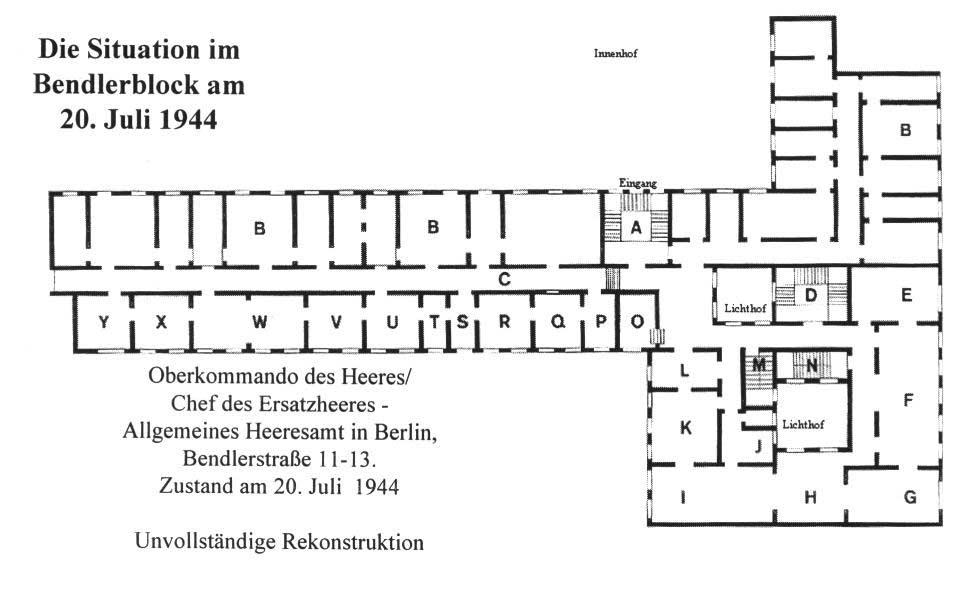 A Über das Treppenhaus IV (heute Aufgang D4) wurden die Verschwörer am 20. Juli zur Exekution im heutigen Ehrenhof geführt. B Diensträume für Offiziere des Allgemeinen Heeresamtes C In diesem Flur kam es am Abend des 20.7.44 zum Schusswechsel, bei dem Stauffenberg leicht verletzt wurde D Separates Treppenhaus zur Bendlerstraße, heute Stauffenbergstraße E Arbeitszimmer für den Offizier vom Dienst (OvD) F Vorzimmer von Claus Schenk Graf von Stauffenberg als Stabschef des Befehlshabers des Ersatzheeres und Chefs der Heeresrüstung G Seit 1. Juni 1944 Arbeitszimmer von Oberst Claus Schenk Graf von Stauffenberg als Stabschef des Befehlshabers des Ersatzheeres und Chefs der Heeresrüstung H Kartenzimmer I Arbeitszimmer von Generaloberst Friedrich Fromm als Befehlshaber des Ersatzheeres und Chefs der Heeresrüstung. Nach Fromm´s Verhaftung am 20. Juli Zentrale des Umsturzversuches. Hier erklärte sich Fromm in der Nacht zum 21. Juli 1944 zum Standgericht und befiehlt nach Ludwig Beck´s Freitod die Erschießung von Stauffenberg, Olbricht, Mertz, Quirnheims und Werner von Haeften. J Anrichte/Abstellraum K Arbeitszimmer des Adjutanten von Generaloberst Fromm, Rittmeister Heinz-Ludwig Bartram L Registratur/Schreibkraft M Aufgang zur Dienstwohnung von Generaloberst Friedrich Fromm, in der er am Nachmittag des 20. Juli 1944 gefangengehalten wird N Treppenhaus O Wachraum für den Offizier vom Dienst P Vorzimmer des Ersten Generalstabsoffiziers (Ia) im Allgemeinen Heeresamt Q Arbeitszimmer des Ersten Generalstabsoffiziers (Ia) im Allgemeinen Heeresamt, Oberst Bolko von der Heyde R Arbeitszimmer des Generalstabsoffiziers (Ia I), Oberstleutnant Karl Pridun S Vorzimmer des Ia I T Vorzimmer /Raum mit Feldbett U Arbeitszimmer des Stabschefs im Allgemeinen Heeresamt (bis 1. Juni 1944 Oberst Claus Schenk Graf von Stauffenberg, danach Oberst Albrecht Ritter Mertz von Quirnheim V Vorzimmer mit den Sekretärinnen Anni Lerche und Delia Ziegler W Arbeitszimmer von General Friedrich Olbricht als Chef des Allgemeinen Heeresamtes im Oberkommando des Heeres X Arbeitszimmer von Oberstleutnant Fritz von der Lancken als Adjutant Olbrichts Y Registratur für geheime Kommandosachen |